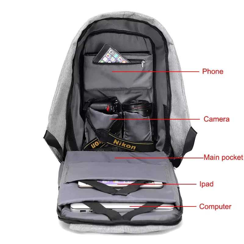 Anti Theft Backpack has a USB Charging Port and a data cable, you can connect your power bank and recharge mobile phones.