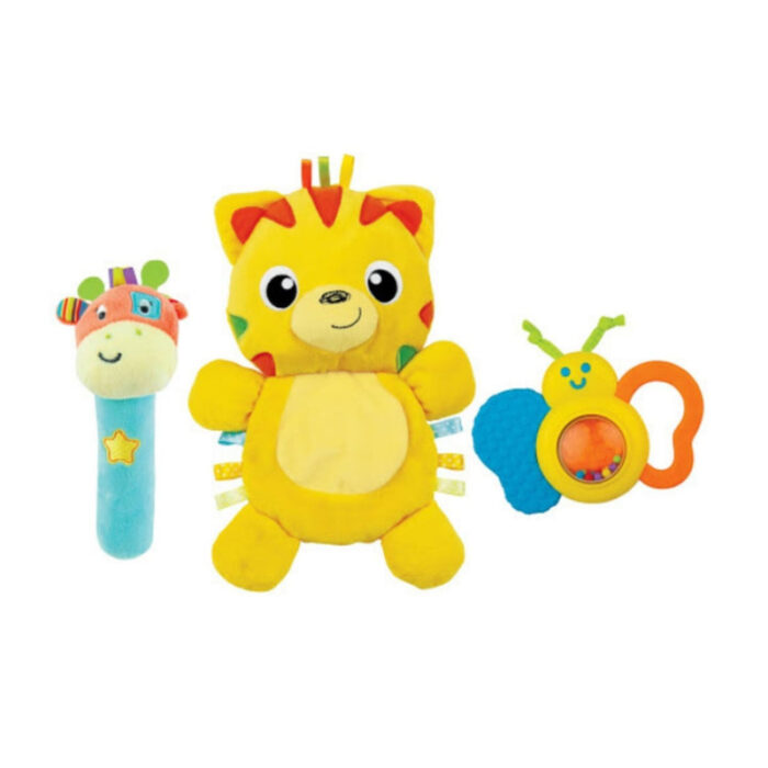 also a Flower-shaped teether and a soft and manageable elephant plush