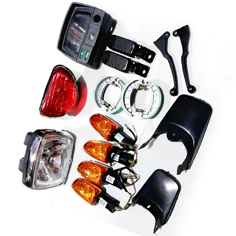 What’s in the box:1 x Bike Headlight, 1 x Back Light (Tail Light), 1 x Meter Case (Speedometer Housing), 4 x Indicators (Turn Signals), 2 x Brake Shoes, 2 x Fortress, 2 x Clutch, 2 x Mudflaps